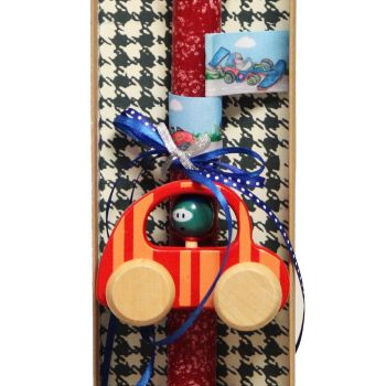Διακοσμημένη με ένα ξύλινο αυτοκινητάκι παιχνίδι. Το κερί είναι αρωματικό, χειροποίητο και κατασκευάζεται στην Ελλάδα. Τα υλικά διακόσμησης είναι υψηλής ποιότητας και εισάγονται αποκλειστικά από την SYNCHRONIA. Τα αντικείμενα σχεδιάζονται ή επιλέγονται όχι μόνο για την αισθητική αλλά και για την αυθεντικότητα, την φιλικότητα προς το περιβάλλον και το δίκαιο εμπόριο. Η βάση προβολής και το εξωτερικό κουτί δώρου περιλαμβάνονται. Ύψος λαμπάδας: 30εκ.