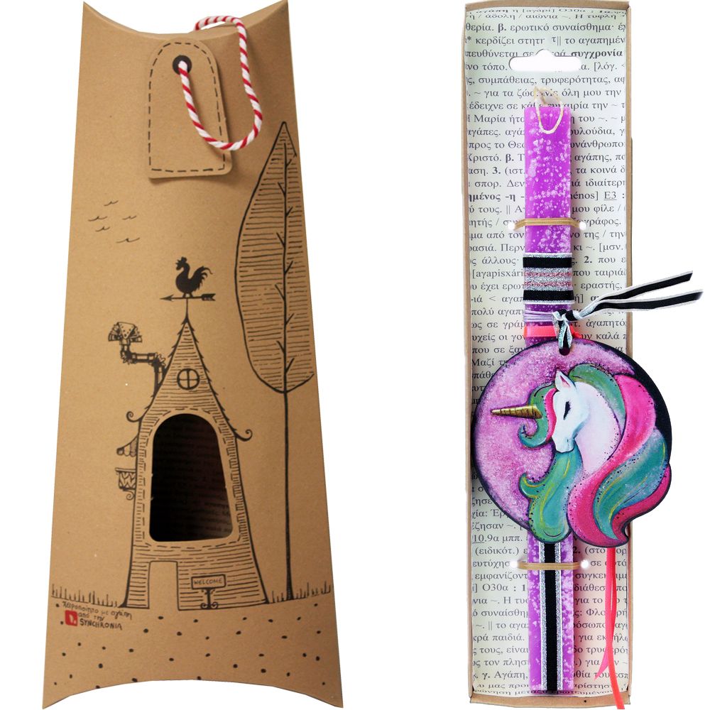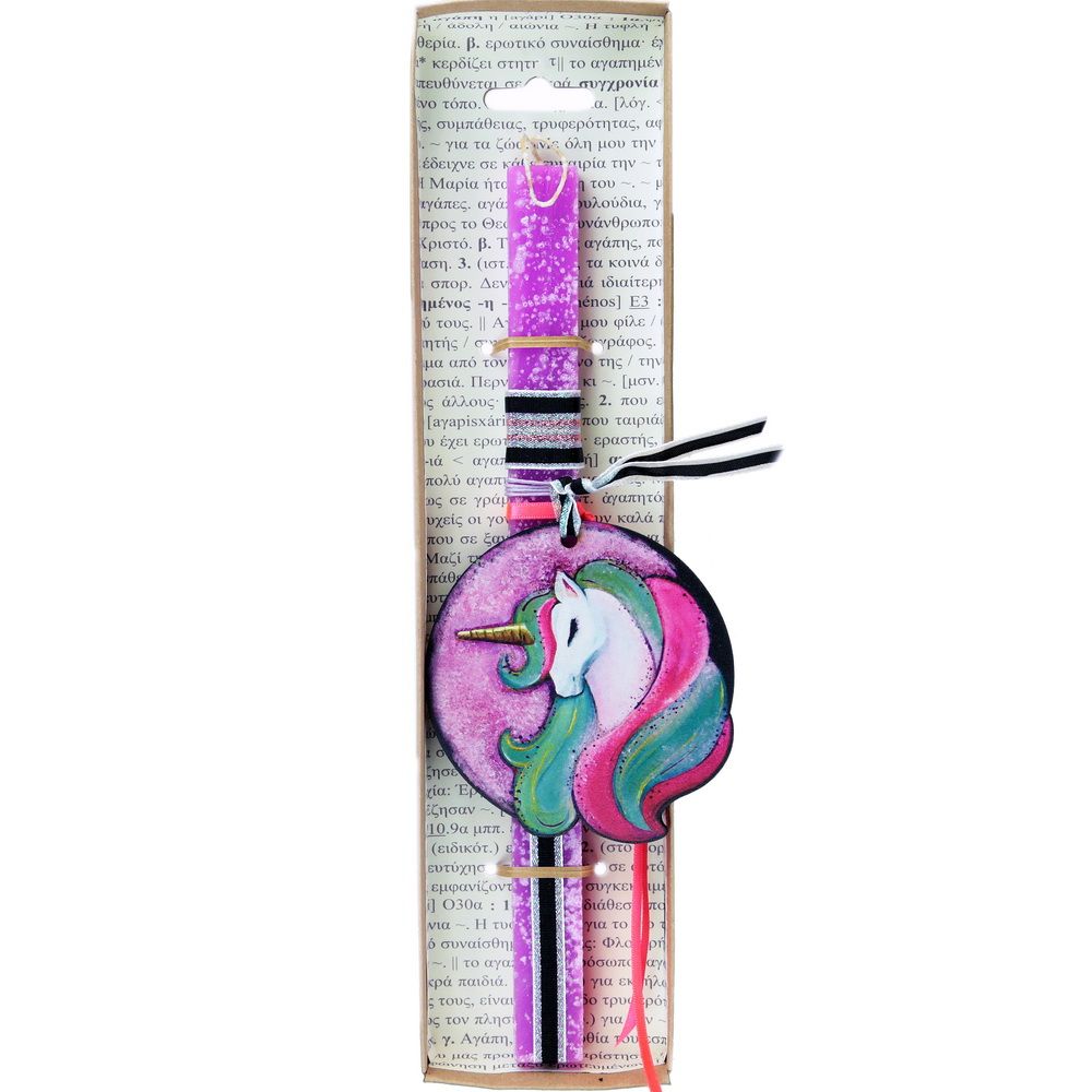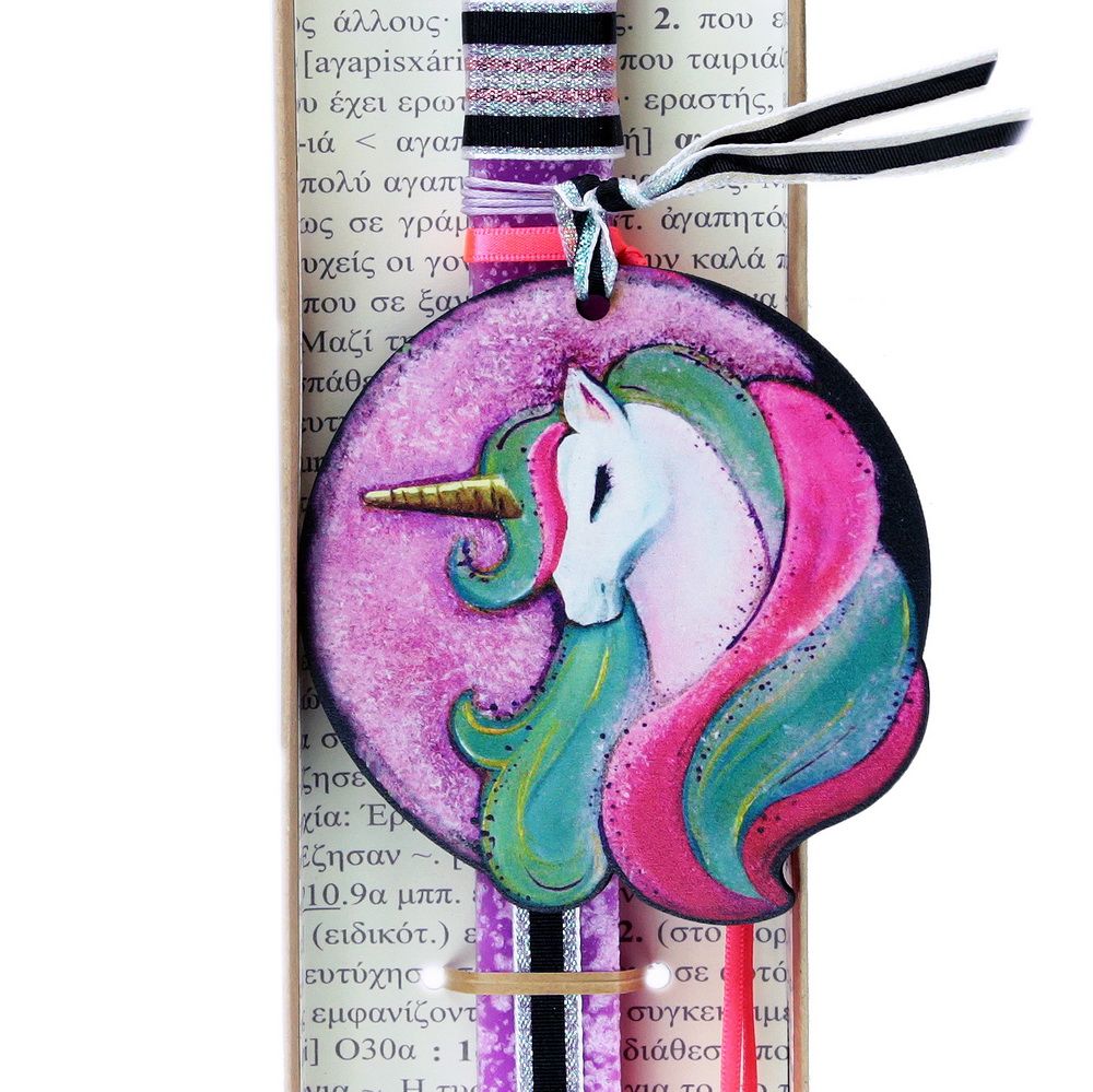 Πασχαλινή λαμπάδα με έναν υπέροχο ζωγραφισμένο μονόκερο που μας ταξιδεύει στην χώρα των ονείρων και των ουράνιων τόξων.