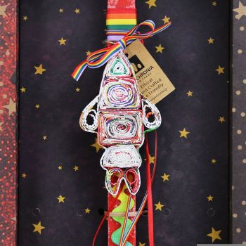 Πασχαλινή λαμπάδα διακοσμημένη με ένα χειροποίητο στολίδι φτιαγμένο με την τεχνική quilling από ανακυκλωμένα περιοδικά. Τα υλικά διακόσμησης είναι υψηλής ποιότητας και εισάγονται αποκλειστικά από την SYNCHRONIA. Τα αντικείμενα σχεδιάζονται ή επιλέγονται για την αισθητική, την αυθεντικότητα, την φιλικότητα προς το περιβάλλον και το δίκαιο εμπόριο. • Το κερί είναι αρωματικό, χειροποίητο και κατασκευάζεται στην Ελλάδα • Περιλαμβάνεται η πρωτότυπη συσκευασία δώρου με ποτηράκι για το κερί • Ύψος λαμπάδας: 30εκ. •• Μέγεθος συσκευασίας: 20x5,5x40 εκ.