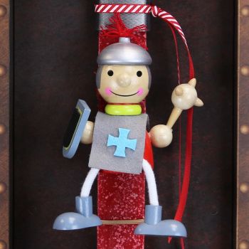 Πασχαλινή λαμπάδα διακοσμημένη με έναν ξύλινο καθιστό στρατιώτη. Πολύ ωραίο παιχνίδι με πόδια από σκοινί και λεπτομέρειες από τσόχα. Μαζί με το φοβερό κερί είναι το τέλειο δώρο για το βαφτιστήρι! Τα υλικά διακόσμησης είναι υψηλής ποιότητας και εισάγονται αποκλειστικά από την SYNCHRONIA. Τα αντικείμενα σχεδιάζονται ή επιλέγονται όχι μόνο για την αισθητική αλλά και για την αυθεντικότητα, την φιλικότητα προς το περιβάλλον και το δίκαιο εμπόριο. • Το κερί είναι αρωματικό, χειροποίητο και κατασκευάζεται στην Ελλάδα • Περιλαμβάνεται η πρωτότυπη συσκευασία δώρου με ποτηράκι για το κερί • Ύψος λαμπάδας: 30εκ.• Μέγεθος συσκευασίας: 20x5,5x40 εκ.