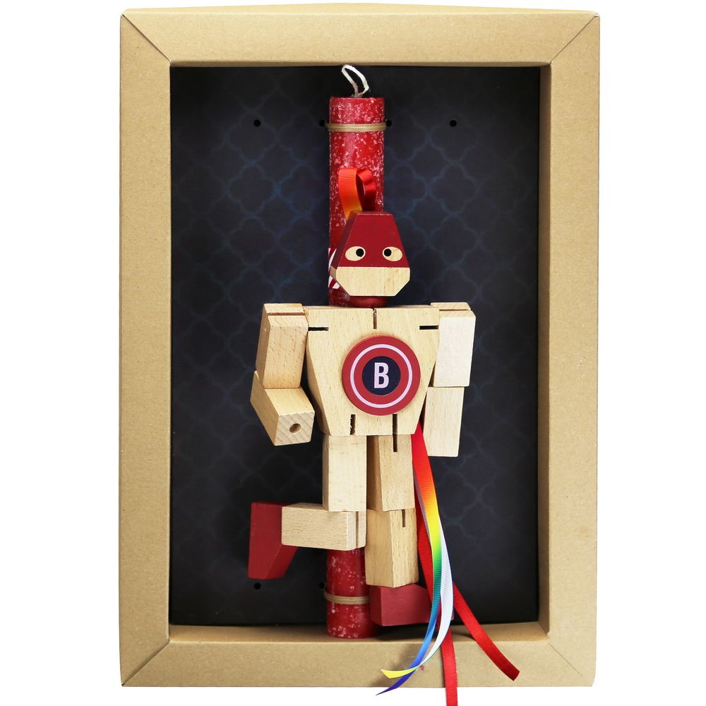 Διακοσμημένη με έναν τεράστιο σούπερ ήρωα ξύλινο παιχνίδι. Το κερί είναι αρωματικό, χειροποίητο και κατασκευάζεται στην Ελλάδα. Τα υλικά διακόσμησης είναι υψηλής ποιότητας και εισάγονται αποκλειστικά από την SYNCHRONIA. Τα αντικείμενα σχεδιάζονται ή επιλέγονται όχι μόνο για την αισθητική αλλά και για την αυθεντικότητα, την φιλικότητα προς το περιβάλλον και το δίκαιο εμπόριο.