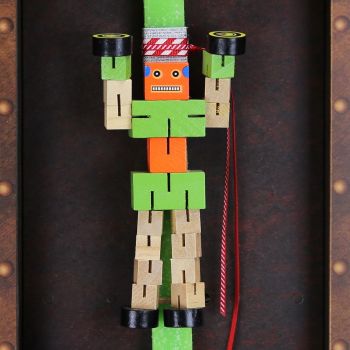 Παιδική λαμπάδα διακοσμημένη έναν τρομερό ξύλινο transformer που όπως υποδηλώνει και τ’ όνομά του αλλάζει μορφές ανάλογα με την φαντασία του παιδιού. Αγαπημένο και διασκεδαστικό παιχνίδι. Το κερί είναι αρωματικό, χειροποίητο και κατασκευάζεται στην Ελλάδα. Τα υλικά διακόσμησης είναι υψηλής ποιότητας και εισάγονται αποκλειστικά από την SYNCHRONIA. Τα αντικείμενα σχεδιάζονται ή επιλέγονται όχι μόνο για την αισθητική αλλά και για την αυθεντικότητα, την φιλικότητα προς το περιβάλλον και το δίκαιο εμπόριο. Η βάση προβολής και το εξωτερικό κουτί δώρου περιλαμβάνονται. Ύψος λαμπάδας: 30εκ.• Μέγεθος συσκευασίας: 20x5,5x40 εκ.