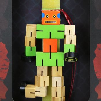 Παιδική λαμπάδα διακοσμημένη έναν τρομερό ξύλινο transformer που όπως υποδηλώνει και τ’ όνομά του αλλάζει μορφές ανάλογα με την φαντασία του παιδιού. Αγαπημένο και διασκεδαστικό παιχνίδι. Το κερί είναι αρωματικό, χειροποίητο και κατασκευάζεται στην Ελλάδα. Τα υλικά διακόσμησης είναι υψηλής ποιότητας και εισάγονται αποκλειστικά από την SYNCHRONIA. Τα αντικείμενα σχεδιάζονται ή επιλέγονται όχι μόνο για την αισθητική αλλά και για την αυθεντικότητα, την φιλικότητα προς το περιβάλλον και το δίκαιο εμπόριο. Η βάση προβολής και το εξωτερικό κουτί δώρου περιλαμβάνονται. Ύψος λαμπάδας: 30εκ.