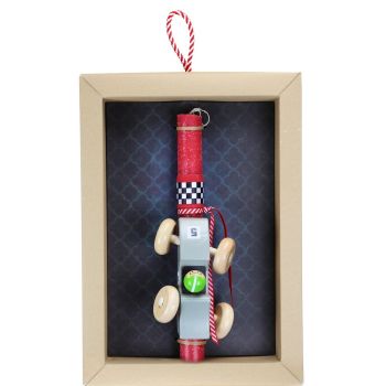 Παιδική πασχαλινή λαμπάδα διακοσμημένη με ένα ξύλινο αυτοκίνητο TWISTER. Μεγάλες ρόδες που μπορούν να πάρουν μεγάλη κλίση και να κάνουν φοβερές στροφές. Τέλειο δώρο για το βαφτιστήρι ειδικά αν αγαπάει τα αυτοκίνητα! Διαλέξτε από τα διάφορα σχέδια. Τα υλικά διακόσμησης είναι υψηλής ποιότητας και εισάγονται αποκλειστικά από την SYNCHRONIA. Τα αντικείμενα σχεδιάζονται ή επιλέγονται όχι μόνο για την αισθητική αλλά και για την αυθεντικότητα, την φιλικότητα προς το περιβάλλον και το δίκαιο εμπόριο. • Το κερί είναι αρωματικό, χειροποίητο και κατασκευάζεται στην Ελλάδα • Περιλαμβάνεται η πρωτότυπη συσκευασία δώρου με ποτηράκι για το κερί • Ύψος λαμπάδας: 30εκ. Μέγεθος συσκευασίας: 25x5,5x40 εκ