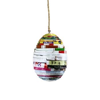 Σετ με 6 κρεμαστά αυγά φτιαγμένα με τεχνική quilling από ανακύκλωση περιοδικών. Στο quilling σελίδες περιοδικών τυλίγονται με το χέρι σε διάφορα σχήματα και δημιουργούν ξεχωριστά αντικείμενα. Λόγω της φύσης του υλικού οι αποχρώσεις έχουν ελαφρές χρωματικές διαφορές. • Προϊόν δίκαιου εμπορίου • Υλικά: ανακυκλωμένα περιοδικά • Χειροποίητο • Κατασκευάζεται στο Βιετνάμ • Διάσταση: 4x6 εκ.