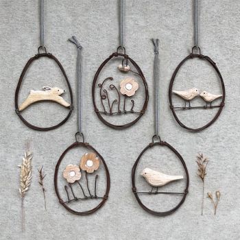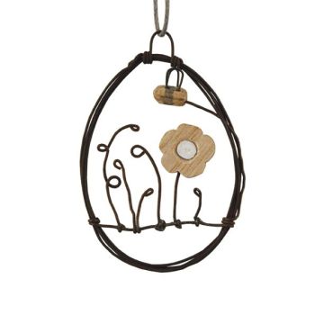 Χειροποίητο κρεμαστό στολίδι με σύρμα σε σχήμα αυγού. Στο εσωτερικό του αυγού μια μικρή παράσταση με ξύλινα πουλάκια, λουλούδια ή λαγούς. Ένα συλλεκτικό Πασχαλινό στολίδι από την East of India και την Synchronia. • Υλικό: Σύρμα, ξύλο • Χειροποίητο • Προέλευση: Αγγλία • Διάσταση: 6.2x4.7 εκ.