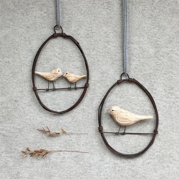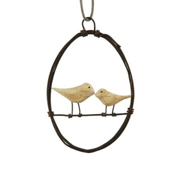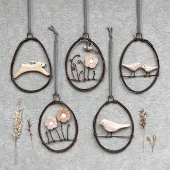 Χειροποίητο κρεμαστό στολίδι με σύρμα σε σχήμα αυγού. Στο εσωτερικό του αυγού μια μικρή παράσταση με ξύλινα πουλάκια, λουλούδια ή λαγούς. Ένα συλλεκτικό Πασχαλινό στολίδι από την East of India και την Synchronia.