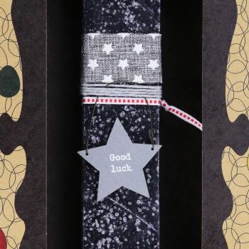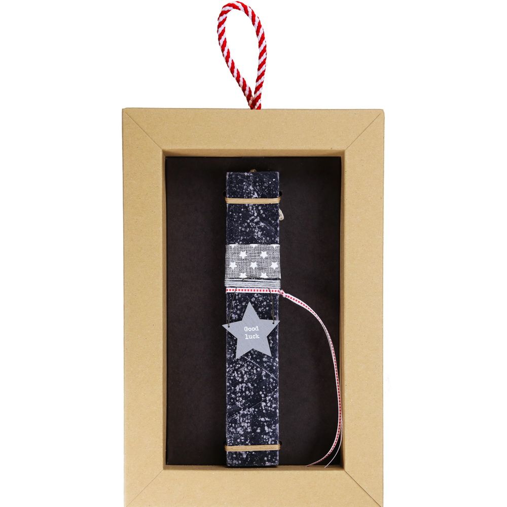 Διακοσμημένη με ένα γκρι ξύλινο αστεράκι και ένα μήνυμα. Συνδυάζεται με κορδέλα στο ίδιο χρώμα και ανάμεσα στο γκρι μια λεπτή κορδέλα δίνει μια πινελιά κόκκινου που κάνει το αποτέλεσμα πιο δυναμικό. Το κερί είναι αρωματικό, χειροποίητο και κατασκευάζεται στην Ελλάδα. Τα υλικά διακόσμησης είναι υψηλής ποιότητας και εισάγονται αποκλειστικά από την SYNCHRONIA. Τα αντικείμενα σχεδιάζονται ή επιλέγονται όχι μόνο για την αισθητική αλλά και για την αυθεντικότητα, την φιλικότητα προς το περιβάλλον και το δίκαιο εμπόριο. Έρχεται σε συσκευασία δώρου. Ύψος λαμπάδας: 20εκ.