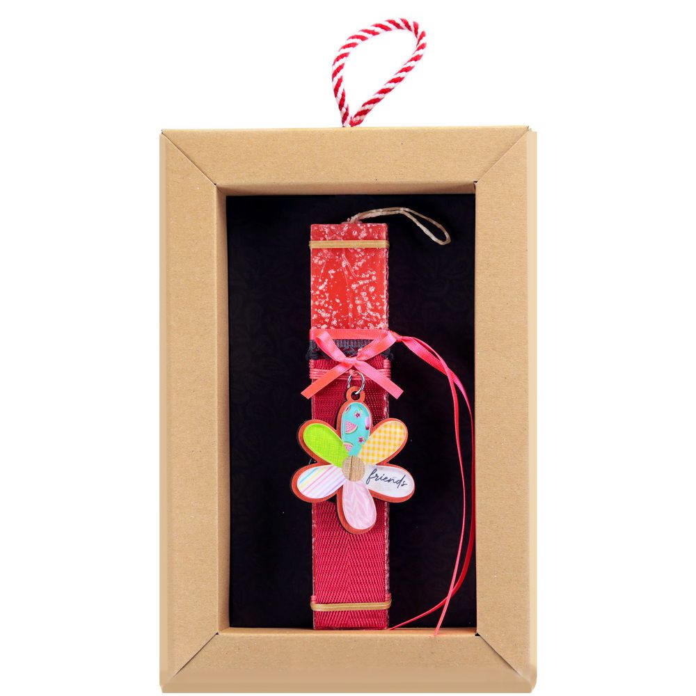 Πασχαλινή λαμπάδα 20 εκ σε συρταρωτό κουτί δώρου διακοσμημένη με ένα λουλούδι μπρελόκ σε τέλεια χρώματα και μοτίβα το οποίο θα βάλετε στα κλειδιά σας μετά το Πάσχα. Διαλέξτε από τα πολλά διαφορετικά σχέδια. Τα υλικά διακόσμησης είναι υψηλής ποιότητας και εισάγονται αποκλειστικά από την SYNCHRONIA. Τα αντικείμενα σχεδιάζονται ή επιλέγονται όχι μόνο για την αισθητική αλλά και για την αυθεντικότητα, την φιλικότητα προς το περιβάλλον και το δίκαιο εμπόριο. • Το κερί είναι αρωματικό, χειροποίητο και κατασκευάζεται στην Ελλάδα • Περιλαμβάνεται η πρωτότυπη συσκευασία δώρου με ποτηράκι για το κερί • Ύψος λαμπάδας: 20εκ.