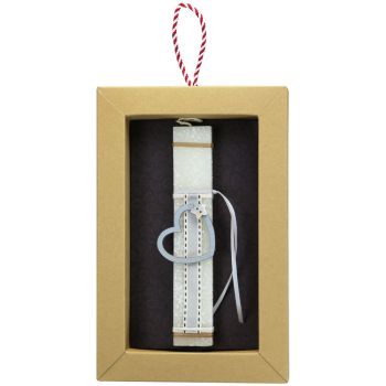 Διακοσμημένη με μια λιτή ξύλινη καρδιά και ένα φιλντισένιο κουμπί. Το κερί είναι αρωματικό, χειροποίητο και κατασκευάζεται στην Ελλάδα. Τα υλικά διακόσμησης είναι υψηλής ποιότητας και εισάγονται αποκλειστικά από την SYNCHRONIA. Τα αντικείμενα σχεδιάζονται ή επιλέγονται όχι μόνο για την αισθητική αλλά και για την αυθεντικότητα, την φιλικότητα προς το περιβάλλον και το δίκαιο εμπόριο. Έρχεται σε συσκευασία δώρου. Ύψος λαμπάδας: 20εκ.