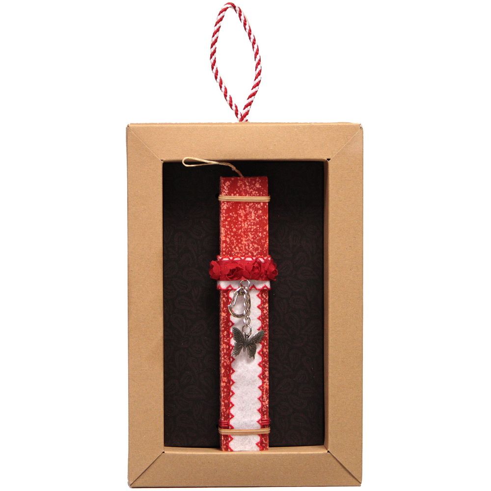 Διακοσμημένη με μια πεταλούδα μπρελόκ από κασσίτερο. Το κερί είναι αρωματικό, χειροποίητο και κατασκευάζεται στην Ελλάδα. Τα υλικά διακόσμησης είναι υψηλής ποιότητας και εισάγονται αποκλειστικά από την SYNCHRONIA. Τα αντικείμενα σχεδιάζονται ή επιλέγονται όχι μόνο για την αισθητική αλλά και για την αυθεντικότητα, την φιλικότητα προς το περιβάλλον και το δίκαιο εμπόριο. Έρχεται σε συσκευασία δώρου. Ύψος λαμπάδας: 20εκ.