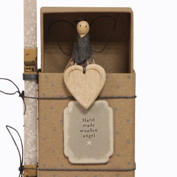 Ένας υπέροχος χειροποίητος άγγελος από ένα ξύλινο μανταλάκι που έγινε η βάση και ντύθηκε με ρούχα και αξεσουάρ. Είναι τοποθετημένη σε χάρτινο συρταρωτό κουτί που είναι ζωγραφισμένο στο χέρι. Το κερί είναι αρωματικό, χειροποίητο και κατασκευάζεται στην Ελλάδα. Τα υλικά διακόσμησης είναι υψηλής ποιότητας και εισάγονται αποκλειστικά από την SYNCHRONIA. Τα αντικείμενα επιλέγονται για την αυθεντικότητα και την μοναδικότητά τους. Βασικό μας κριτήριο είναι πάντοτε η επιλογή προϊόντων φιλικών προς το περιβάλλον και τον άνθρωπο. Η βάση προβολής και το εξωτερικό κουτί δώρου περιλαμβάνονται. Ύψος λαμπάδας: 30εκ.