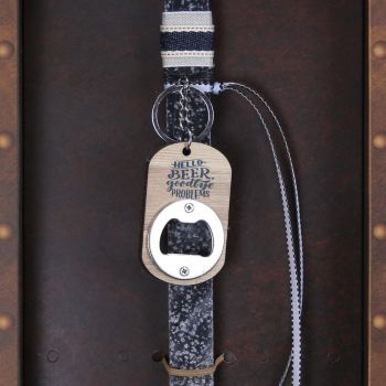 Πασχαλινή λαμπάδα διακοσμημένη με ένα ανοιχτήρι για μπύρες. Θα την βρείτε σε πολλές εκδοχές και είναι τέλειο δώρο για τους ενήλικους φίλους μας. Τα υλικά διακόσμησης είναι υψηλής ποιότητας και εισάγονται αποκλειστικά από την SYNCHRONIA. Τα αντικείμενα σχεδιάζονται ή επιλέγονται για την αισθητική, την αυθεντικότητα, την φιλικότητα προς το περιβάλλον και το δίκαιο εμπόριο. • Το κερί είναι αρωματικό, χειροποίητο και κατασκευάζεται στην Ελλάδα • Περιλαμβάνεται η εντυπωσιακή συσκευασία δώρου με ποτηράκι για το κερί • Ύψος λαμπάδας: 30εκ. • Μέγεθος συσκευασίας: 20x5,5x40 εκ.