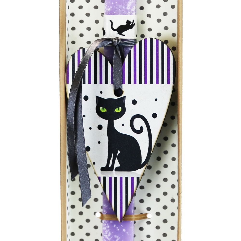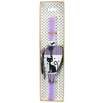Λαμπάδα διακοσμημένη με μια φίνα καρδιά ζωγραφισμένη με μια κομψή γάτα σε μαύρο χρώμα. Το κερί είναι αρωματικό, χειροποίητο και κατασκευάζεται στην Ελλάδα. Τα υλικά διακόσμησης είναι υψηλής ποιότητας και εισάγονται αποκλειστικά από την SYNCHRONIA. Τα αντικείμενα σχεδιάζονται ή επιλέγονται όχι μόνο για την αισθητική αλλά και για την αυθεντικότητα, την φιλικότητα προς το περιβάλλον και το δίκαιο εμπόριο. Η βάση προβολής και το εξωτερικό κουτί δώρου περιλαμβάνονται. Ύψος λαμπάδας: 30εκ.