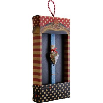 Πασχαλινή λαμπάδα με μια μεταλλική vintage φλοράλ καρδούλα, διπλής όψης και συνδυασμένη με κορδέλες σε υπέροχα χρώματα και υφές. Μια καρδούλα που θα κάψει … καρδιές! Τα υλικά διακόσμησης είναι υψηλής ποιότητας και εισάγονται αποκλειστικά από την SYNCHRONIA. Τα αντικείμενα σχεδιάζονται ή επιλέγονται όχι μόνο για την αισθητική αλλά και για την αυθεντικότητα, την φιλικότητα προς το περιβάλλον και το δίκαιο εμπόριο. • Το κερί είναι αρωματικό, χειροποίητο και κατασκευάζεται στην Ελλάδα • Περιλαμβάνεται η πρωτότυπη συσκευασία δώρου με ποτηράκι για το κερί • Ύψος λαμπάδας: 30εκ.• Μέγεθος συσκευασίας: 20x5,5x40 εκ.
