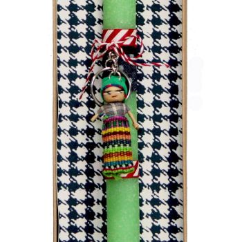 Διακοσμημένη με worry doll από την Γουατεμάλα. Σύμφωνα με τον μύθο των Μάγιας οι κούκλες αυτές μπορούν να πάρουν τις στενωχώριες από τους ανθρώπους. Το κερί είναι αρωματικό, χειροποίητο και κατασκευάζεται στην Ελλάδα. Τα υλικά διακόσμησης είναι υψηλής ποιότητας και εισάγονται αποκλειστικά από την SYNCHRONIA. Τα αντικείμενα επιλέγονται για την αυθεντικότητα και την μοναδικότητά τους. Βασικό μας κριτήριο είναι πάντοτε η επιλογή προϊόντων φιλικών προς το περιβάλλον και τον άνθρωπο. Η βάση προβολής και το εξωτερικό κουτί δώρου περιλαμβάνονται. Ύψος λαμπάδας: 30εκ.
