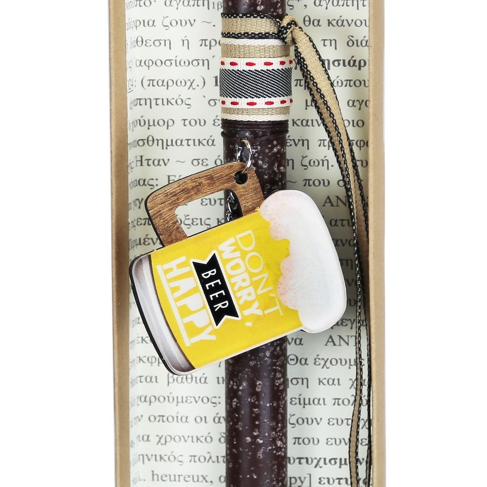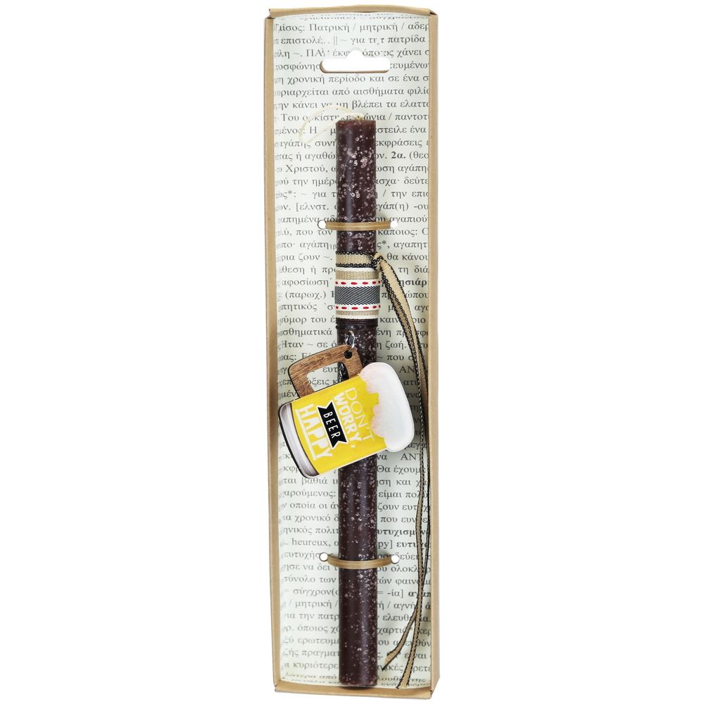 Πασχαλινή λαμπάδα για τους λάτρες της μπύρας! Ένα τέλειο μπρελόκ σε σχήμα ποτηριού μπύρας που θα μείνει μετά το Πάσχα για να κρεμάσετε τα κλειδιά σας. Είναι ξύλινη βάση και έχει επίστρωση από ακρυλικό. Διαλέξτε από τα πολλά διαφορετικά σχέδια. Τα υλικά διακόσμησης είναι υψηλής ποιότητας και εισάγονται αποκλειστικά από την SYNCHRONIA. Τα αντικείμενα σχεδιάζονται ή επιλέγονται όχι μόνο για την αισθητική αλλά και για την αυθεντικότητα, την φιλικότητα προς το περιβάλλον και το δίκαιο εμπόριο. • Το κερί είναι αρωματικό, χειροποίητο και κατασκευάζεται στην Ελλάδα • Περιλαμβάνεται η πρωτότυπη συσκευασία δώρου με ποτηράκι για το κερί • Ύψος λαμπάδας: 30εκ.
