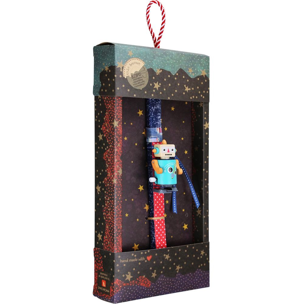 Μια πασχαλινή λαμπάδα που φέρνει τη μαγεία των vintage παιχνιδιών στο σήμερα. Το ξύλινο κουρδιστό ρομποτάκι κινείται και περπατά, χαρίζοντας χαμόγελα και ενθουσιασμό. Ιδανική για μικρά αγόρια, βαφτιστήρια και παιδιά που αγαπούν τα ρετρό παιχνίδια με χαρακτήρα. Διατίθεται σε διαφορετικούς χρωματικούς συνδυασμούς ώστε κάθε παιδί να βρει το αγαπημένο του. Κατασκευασμένη χειροποίητα με ποιοτικά υλικά και προσεγμένη λεπτομέρεια από την ομάδα της Synchronia, συνοδεύεται από οικολογική συσκευασία δώρου υψηλής αισθητικής.