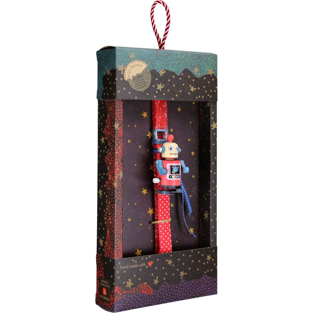Μια πασχαλινή λαμπάδα που φέρνει τη μαγεία των vintage παιχνιδιών στο σήμερα. Το ξύλινο κουρδιστό ρομποτάκι κινείται και περπατά, χαρίζοντας χαμόγελα και ενθουσιασμό. Ιδανική για μικρά αγόρια, βαφτιστήρια και παιδιά που αγαπούν τα ρετρό παιχνίδια με χαρακτήρα. Διατίθεται σε διαφορετικούς χρωματικούς συνδυασμούς ώστε κάθε παιδί να βρει το αγαπημένο του. Κατασκευασμένη χειροποίητα με ποιοτικά υλικά και προσεγμένη λεπτομέρεια από την ομάδα της Synchronia, συνοδεύεται από οικολογική συσκευασία δώρου υψηλής αισθητικής. Υλικό διακοσμητικού: Ξύλινο κουρδιστό παιχνίδι ρομπότ. Προέλευση: Ελληνικός σχεδιασμός – Κατασκευή Ινδία. Διάσταση διακοσμητικού: 9 x 4 x 5 εκ. Διάσταση κεριού: 30 εκ. Διάσταση συσκευασίας: 20 x 5.5 x 40 εκ. Οικολογική συσκευασία δώρου. Περιλαμβάνει το ποτηράκι για το κερί.