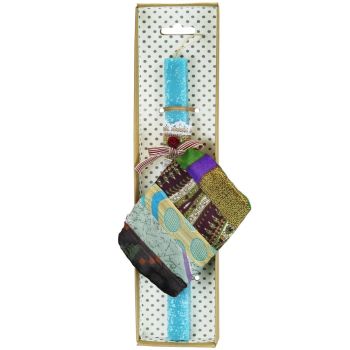 Πασχαλινή λαμπάδα διακοσμημένη με χειροποίητο τσαντάκι από ανακύκλωση μεταξωτών σάρι. Τα χρώματα είναι μοναδικά και είναι όλα υπέροχα! Η φωτογραφία έχει κάποια ενδεικτικά σχέδια. Τα υλικά διακόσμησης είναι υψηλής ποιότητας και εισάγονται αποκλειστικά από την SYNCHRONIA. Τα αντικείμενα σχεδιάζονται ή επιλέγονται για την αισθητική, την αυθεντικότητα, την φιλικότητα προς το περιβάλλον και το δίκαιο εμπόριο. • Το κερί είναι αρωματικό, χειροποίητο και κατασκευάζεται στην Ελλάδα • Περιλαμβάνεται η πρωτότυπη συσκευασία δώρου με ποτηράκι για το κερί • Ύψος λαμπάδας: 30εκ. • Μέγεθος συσκευασίας: 12x5x34 εκ.