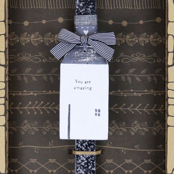 Υπέροχη πασχαλινή λαμπάδα διακοσμημένη με ένα ξύλινο σπιτάκι ζωγραφισμένο στο χέρι και από τις δύο πλευρές με τον τρόπο που μόνο η αγαπημένη μας east of india ξέρει. Χαρίστε μια λαμπάδα με απαράμιλλο στιλ και πείτε: “You are Amazing” ή “ sending you a big hug!”. Είναι σίγουρο ότι θα την λατρέψουν! Τα υλικά διακόσμησης είναι υψηλής ποιότητας και εισάγονται αποκλειστικά από την SYNCHRONIA. Τα αντικείμενα σχεδιάζονται ή επιλέγονται για την αισθητική, την αυθεντικότητα, την φιλικότητα προς το περιβάλλον και το δίκαιο εμπόριο. • Το κερί είναι αρωματικό, χειροποίητο και κατασκευάζεται στην Ελλάδα • Περιλαμβάνεται η εντυπωσιακή συσκευασία δώρου με ποτηράκι για το κερί • Ύψος λαμπάδας: 30εκ. • Μέγεθος συσκευασίας: 20x5,5x40 εκ.